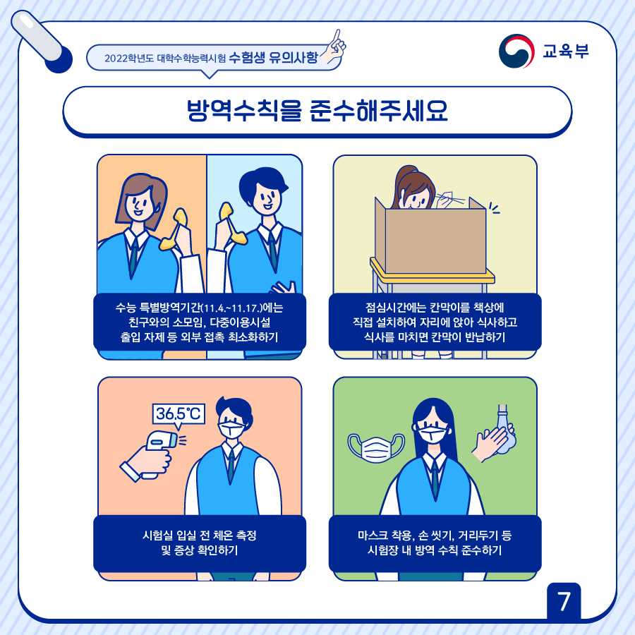- 수능 특별방역기간(11.4.~11.17.)에는 친구와의 소모임, 다중시설이용 자제 등 외부 접촉 최소화하기