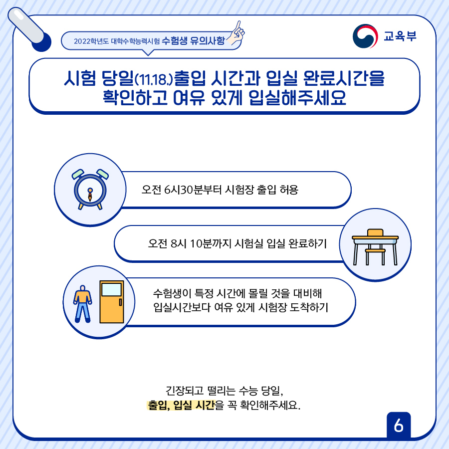 - 오전 6시30분부터 시험실 출입 허용