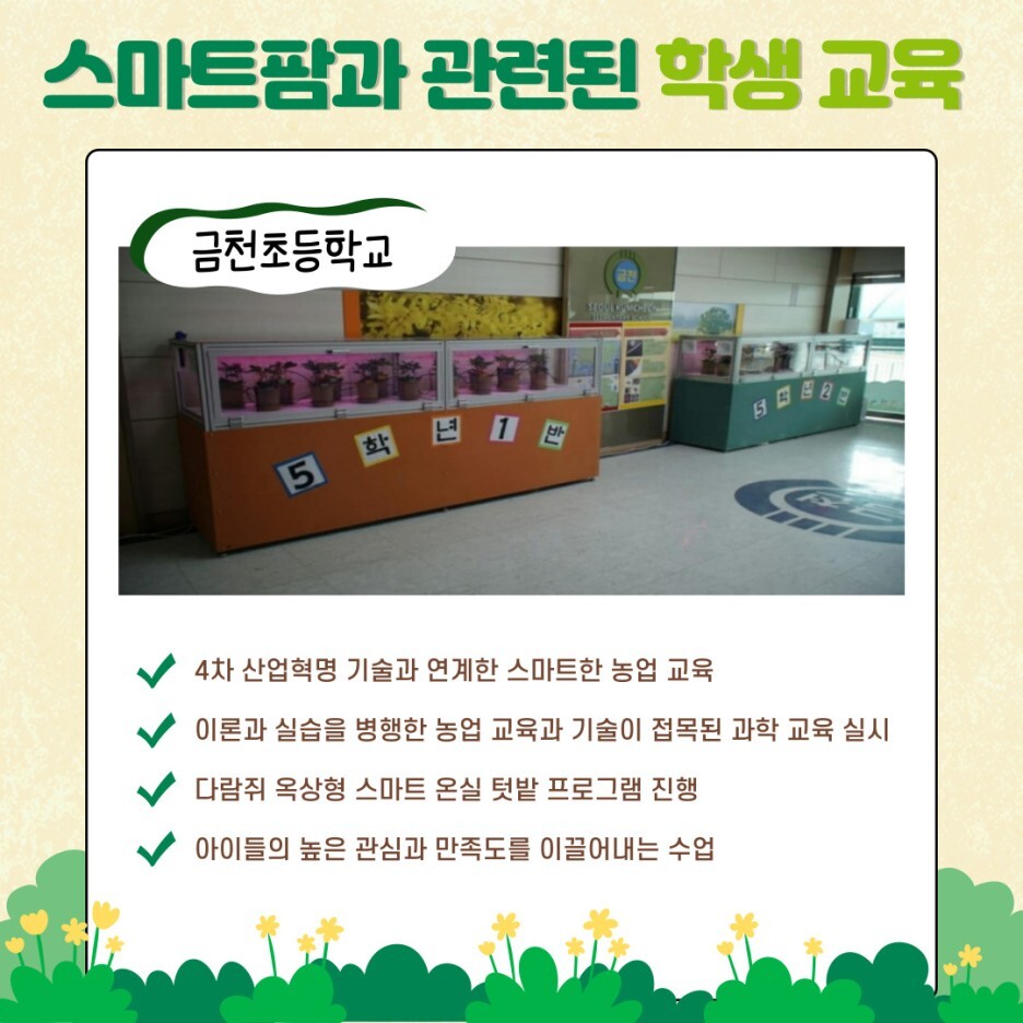 다음으로 스마트팜 교육을 4차산업 관련 기술과 연계하여 시행하고 있는 금천초등학교의 사례입니다. 금천초등학교는 5학년 학생 40명을 대상으로 45분씩 8회차에 거쳐, 친환경 농법, 작물별 수확 방법과 같은 이론과 실습을 병행한 농업 교육과 더불어 데이터 분석 등 4차산업과 관련된 과학 교육을 실시하고 있는데요. 특히, 실내 온실 텃밭을 사물인터넷 기술을 활용하여 원격으로 관리하고 식량 자원을 재배하는 “다람쥐 옥상형 스마트 온실 텃밭” 프로그램을 통해 미래 생태 교육을 스마트하게 시행하고 있다고 합니다. 아이들은 이러한 교육을 통해 식물 생장에 필요한 구체적인 정보를 스마트폰을 활용해 눈으로 직접 확인할 수 있고, 생명의 소중함과 수확의 기쁨을 체험하며 만족도가 높다고 하네요!
