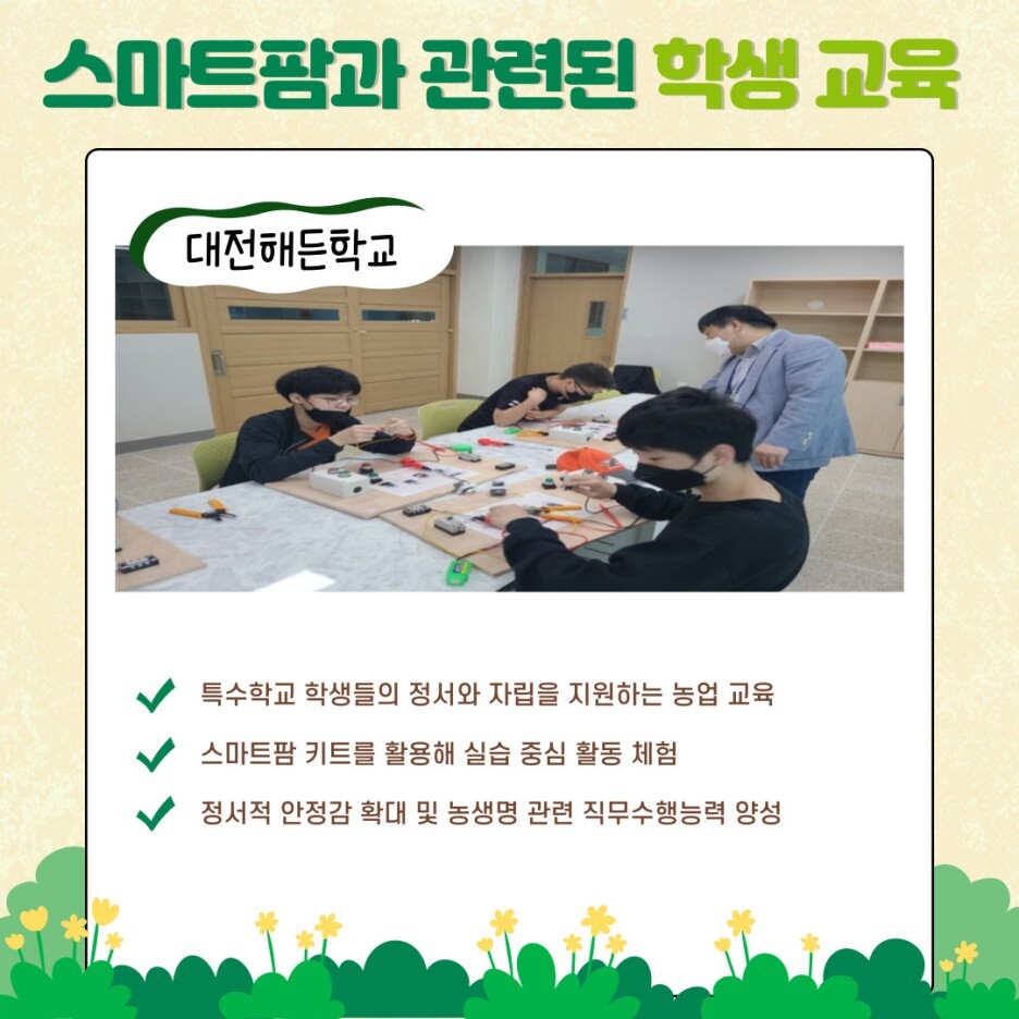 또, 스마트팜 교육을 통해 학생들의 정서와 자립에 실질적으로 도움이 되도록 지원하는 대전해든학교의 사례도 있는데요. 사물인터넷 기술을 활용한 스마트팜 키트를 활용하여 특수학교 학생들이 식물을 관리하는 실습 중심의 활동을 체험할 수 있게 하여, 정서적 안정감을 확대할 수 있을 뿐만 아니라 농생명 관련 직무수행능력도 양성해 취업 역량을 확보할 수 있게 도와주고 있다고 합니다.