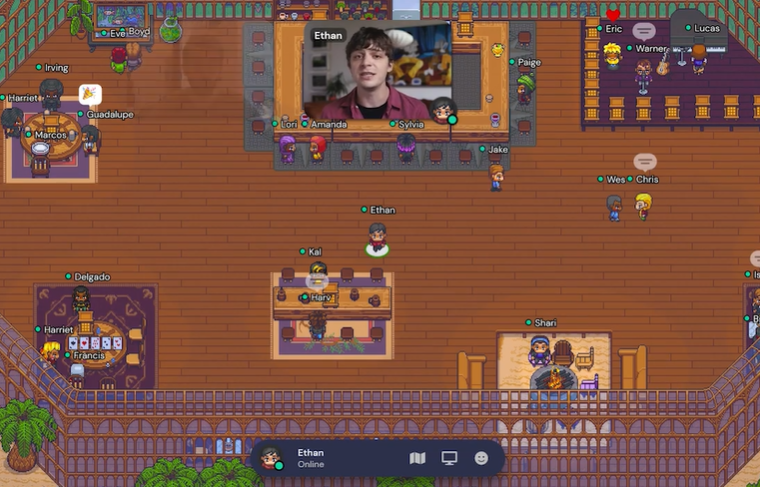 가상세계에는 가상세계를 나타내는 맵과 아바타가 있지만, 게더타운은 3D가 아닌 2D 형식의 픽셀 형태라는 점이 가장 큰 특징인 플랫폼입니다. 다만, 얼굴과 목소리를 공개적으로 선택할 수 있지만 아바타 선택의 폭은 넓지 않습니다. 대신 비밀 대화 기능도 있고, 25명까지는 무료로 사용이 가능하다는 장점이 있는데요. 또한 문서, 영상, 게임 삽입, 화면 공유, 화이트보드 등의 기능을 활용하여 다양한 활동을 진행할 수 있습니다.