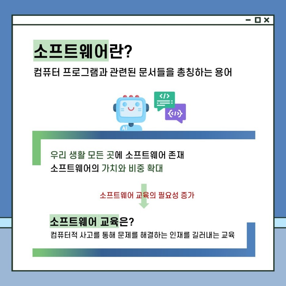 소프트웨어 교육은 컴퓨터적 사고를 통해 문제를 해결하는 인재를 길러내는 교육을 의미합니다. 컴퓨터는 사람이 내린 지시에 따라 판단하고 명령을 수행하게 되는데요, 이때 판단 기준을 정하고 적절한 명령을 내리는 논리적인 사고를 말하는 것이 바로 컴퓨터적 사고입니다. 소프트웨어 교육에서 가장 중요한 것은 바로 문제를 해결할 수 있는 논리를 만드는 설계라고 할 수 있지요.