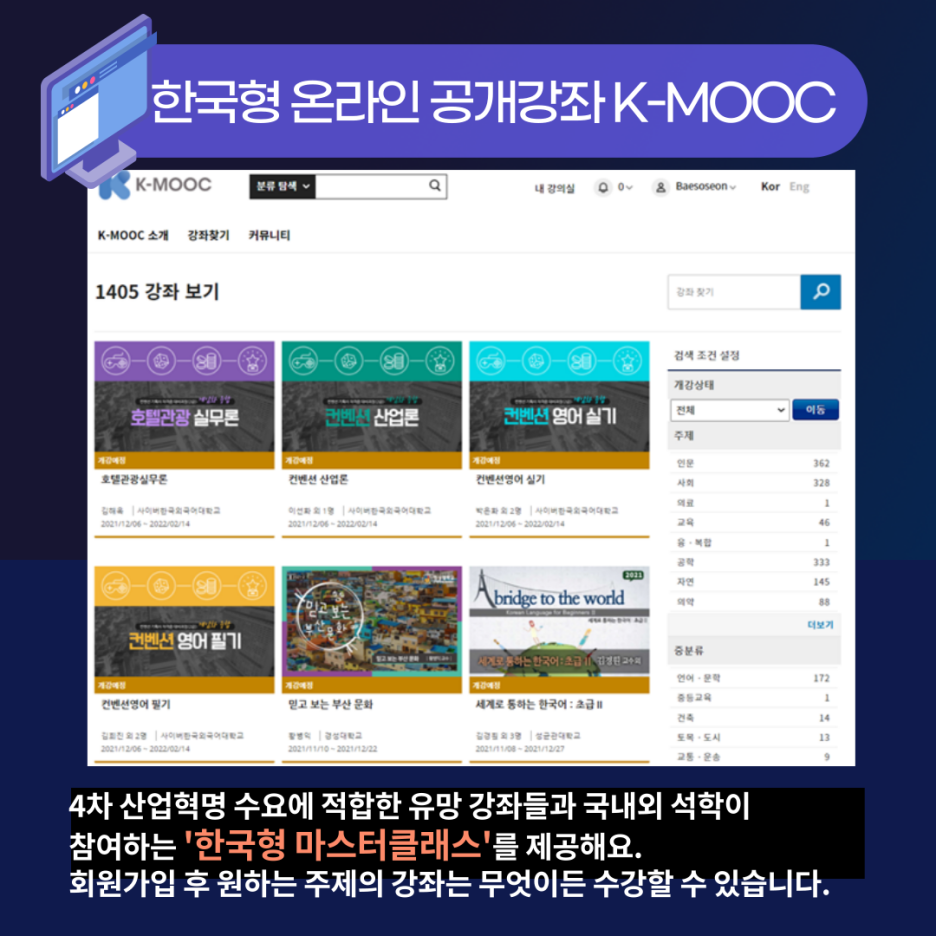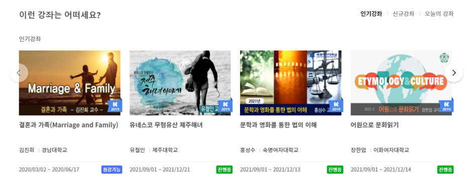 이번 겨울, 스스로 공부하고 싶은 분들이 계시다면 K-MOOC 홈페이지에서 인기 강좌와 집콕 강좌, 오늘의 강좌 등을 확인해보고, 수강을 시작해보면 어떨까요?