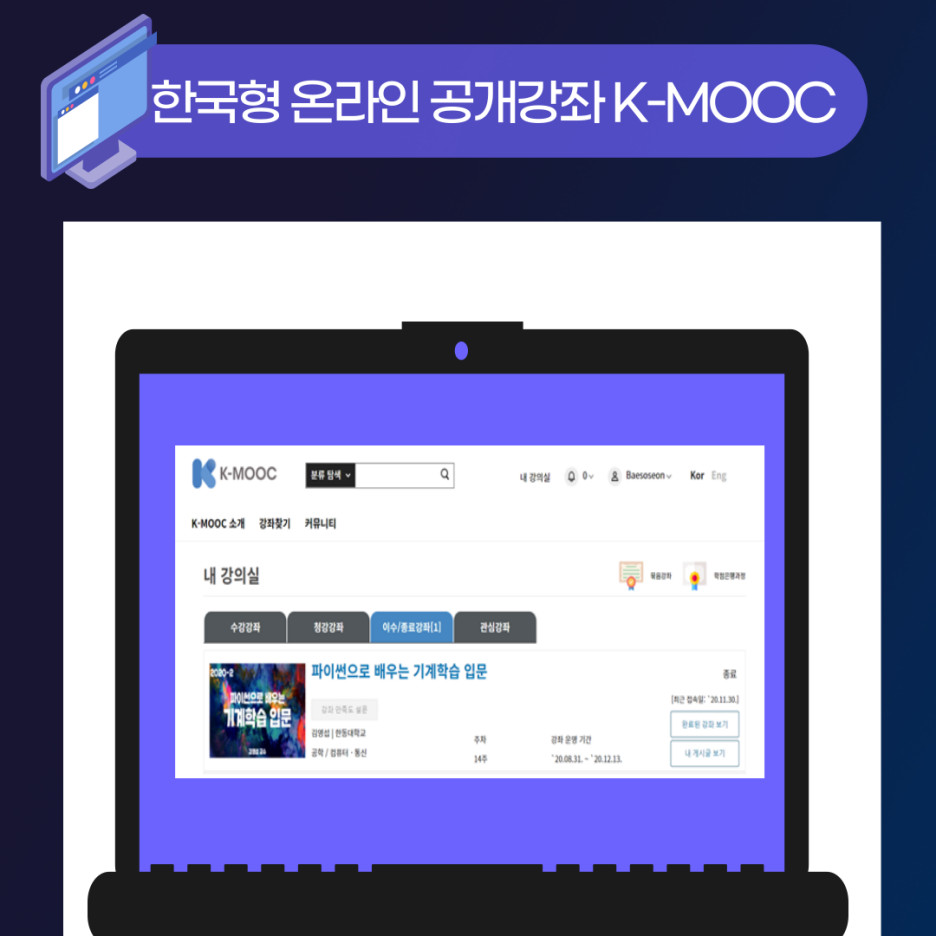 마지막으로 K-MOOC를 소개하고 싶습니다. 저는 K-MOOC 강좌로 공부해본 경험이 있습니다. 다양한 강좌 중에서도 저는 ‘파이썬으로 배우는 기계학습 입문’ 강좌를 선택해 학기 중에 수강했는데요. 해당 콘텐츠를 활용해 인공지능의 기초부터 인공지능에 관한 여러 사례들을 접할 수 있었습니다.