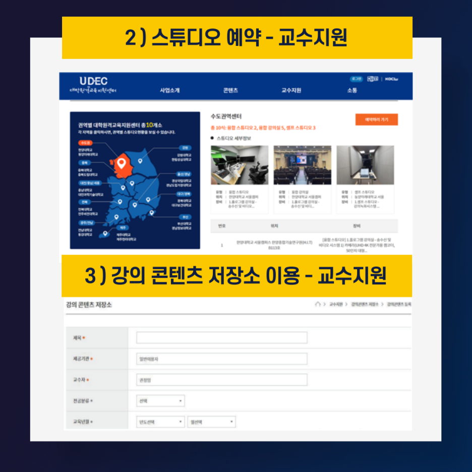 전국에 있는 10개의 대학원격교육지원센터의 스튜디오에서 원격강의를 위한 장비와 장소를 마련하여 제공하고 있습니다. 스튜디오 세부 정보에는 유형, 위치, 보유 장비 등이 등록되어 있습니다. 교수자는 정보를 확인하고, 자신에 맞는 스튜디오를 이용할 수 있는데요. 방법은 간단합니다. 해당 권역 내의 대학교 강사 및 직원은 대학원격교육지원센터 권역별 사이트에 들어가 회원으로 가입합니다. 그다음 본인 인증절차를 통해 강의실 및 스튜디오를 온라인으로 예약하면 됩니다. 자신에게서 가까운 연계대학의 강의실 혹은 스튜디오를 원하는 날짜와 시간에 이용할 수 있다는 점이 가장 큰 장점이 아닐까 싶네요.