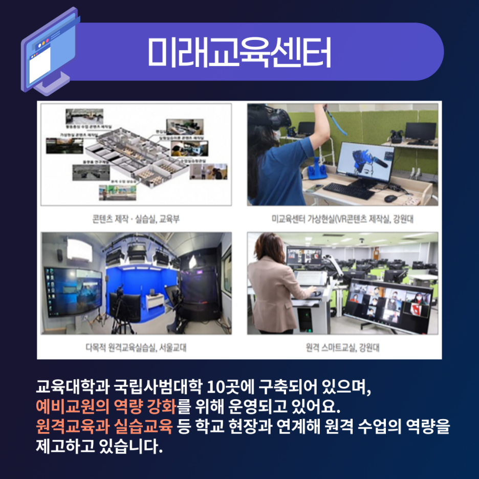 예비 교원, 현직 교원, 그리고 교수자까지 함께 협력한 수업 모형을 연구하고, 학교 현장과 교원양성기관이 연계한 전문적인 학습공동체 등에 참여할 수 있습니다. 이를 통해 각종 원굑교육 방법들을 배울 수 있고 온라인 학급관리, 팀티칭 등의 원격교육 환경에서 반드시 알아두어야 할 내용도 알 수 있답니다. 즉, 미래교육센터에서 제공하는 디지털 인프라를 통해 예비 교원은 원격교육 운영 지식과 경험을 쌓을 수 있다고 할 수 있지요.
