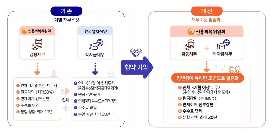 * 기존에는 한국장학재단과 신용회복위원회에 각각 채무조정을 신청해야 했으며, 학자금대출의 경우 원금감면은 사망・심신장애에만 가능하고, 채무조정은 일반상환 학자금 대출에 한정하여 시행되는 등 일부 제한이 존재