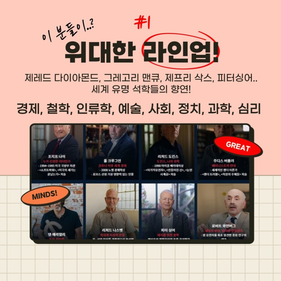 위대한 수업은 세계 곳곳에 흩어져 있는 다양한 분야의 지식들을 알차게 얻을 수 있는 프로그램인 것 같습니다. 두꺼운 책을 읽을 시간이 없거나, 엄두가 나지 않은 분들 중에서도 간편하게 교양 지식을 쌓고 싶은 분들에게 섭외력과 기획력에 둘 다 놀랄 수 있는 위대한 수업, GREAT MINDS를 강력하게 추천드립니다!