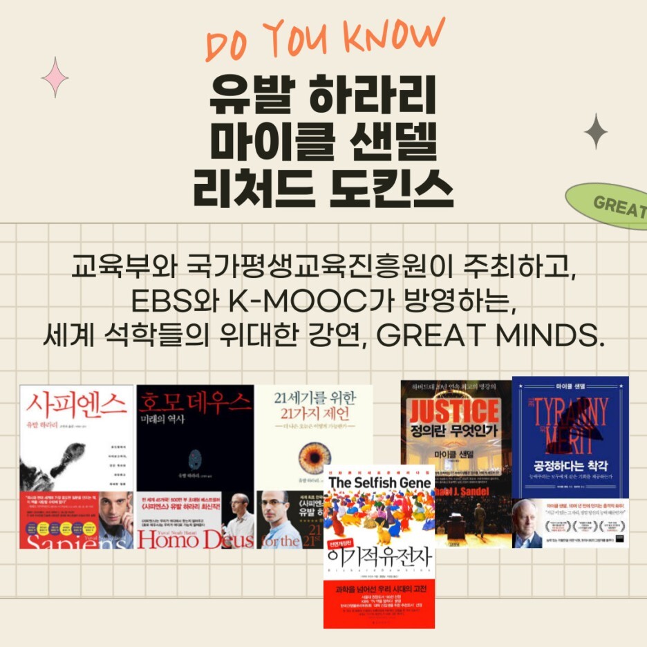 유발 하라리, 마이클 샌델, 리처드 도킨스… 누구일까요? 책을 좋아하는 분들이라면, 그리고 인문, 과학, 사회 분야에 관심을 가진 분들이라면 한 번쯤 들어봤을 법한 석학들입니다. 만약 각 분야에서 저명한 인사들의 강연을 집에서 바로 들을 수 있다면 어떨까요? 그런데 그 일이 실제로 일어났습니다. EBS와 교육부, 그리고 국가평생교육진흥원이 함께 기획한 위대한 수업, GREAT MINDS입니다!