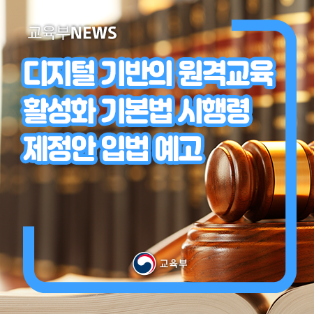 교육부(부총리 겸 교육부장관 유은혜)는 「디지털 기반의 원격교육 활성화 기본법 시행령」 (이하 ‘시행령’) 제정안을 11월 25일(목)부터 2022년 1월 4일(화)까지 40일간 입법 예고한다.