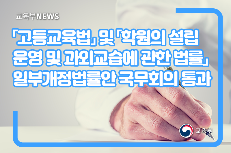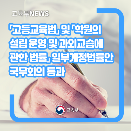 교육부(부총리 겸 교육부장관 유은혜)는 11월 23일(화), 국무회의에서 「고등교육법」 및 「학원의 설립‧운영 및 과외교습에 관한 법률」(이하, ‘학원법’) 일부개정법률안을 심의·의결하였다고 밝혔다.