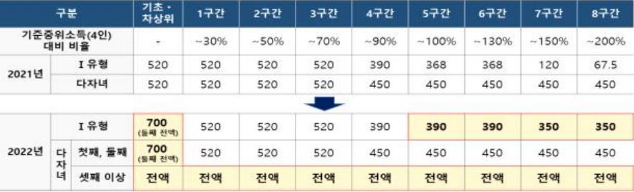내년부터 정부안을 기준으로 학자금지원 5~6구간은 연 390만 원, 7~8구간은 연 350만 원으로 지원 단가를 높이고, 기초·차상위 가구는 첫째 연 700만 원, 둘째 이상은 등록금 전액을, 8구간 이하인 다자녀 가구의 셋째 이상 자녀에게는 등록금 전액을 지원한다.