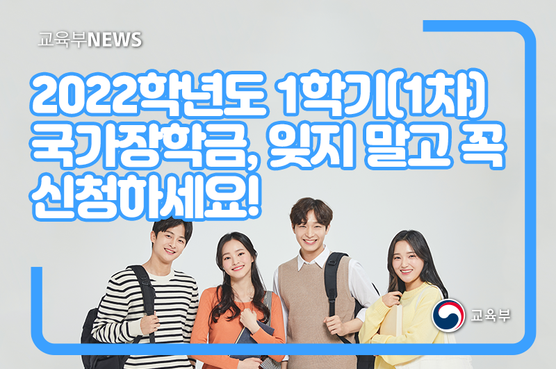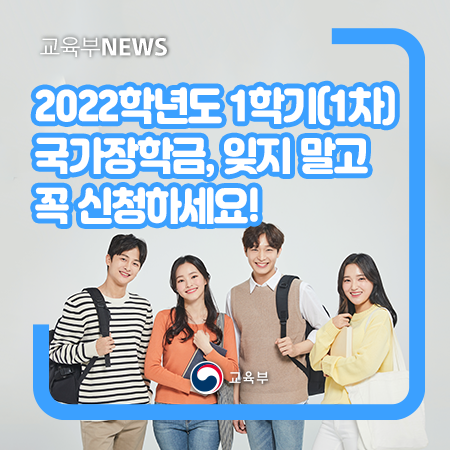 교육부(부총리 겸 교육부장관 유은혜)와 한국장학재단(이사장 정대화, 이하 ‘재단’)은 11월 24일(수) 9시부터 12월 30일(목) 18시까지 2022학년도 1학기 1차 국가장학금 신청을 받는다.
