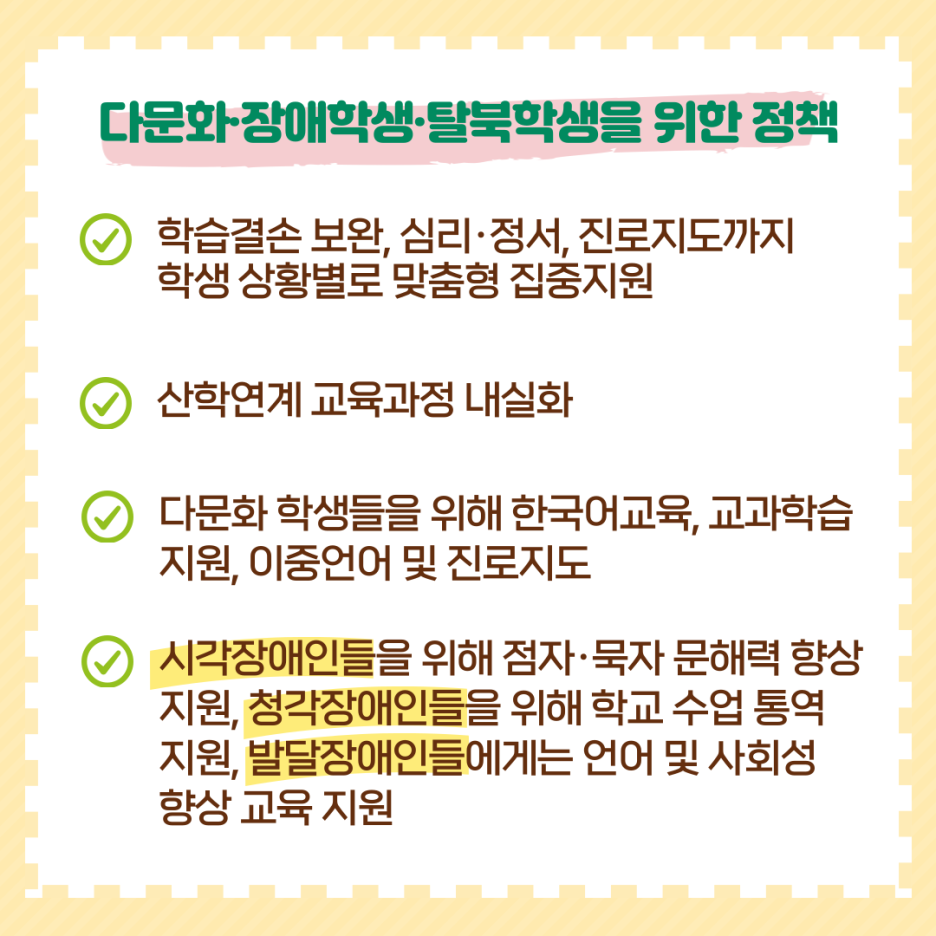 다문화·장애학생·탈북학생 등 취약계층을 위한 정책도 준비되어 있습니다. 이들의 한국 초기 적응부터 학습결손 보완, 심리·정서, 진로지도까지 학생 상황별로 맞춤형 집중지원을 할 예정이라고 하는데요. 우선 다문화 학생들을 위해 한국어 교육과 같은 초기 지원, 교과학습 지원, 이중언어 및 진로지도가 준비되어 있습니다. 시각장애인들을 위해서는 점자·묵자 문해력 향상 지원, 청각장애인들을 위해서는 학교 수업 문자·수어통역 등 학력 향상 지원을, 지체 및 발달장애인들에게는 언어 및 사회성 향상 교육의 지원이 제공됩니다.
