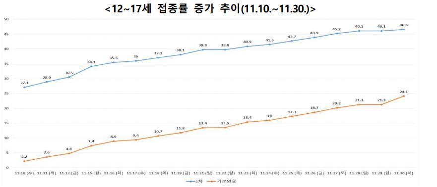 현재(12.1. 0시 기준)까지 12~17세 1차 접종자수는 약 130만 명으로, 인구 대비 1차접종률은 46.9%, 접종 완료율은 24.9%이며 점진적으로 증가 추세에 있다.