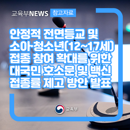 교육부(부총리 겸 교육부장관 유은혜)와 질병관리청(질병관리청장 정은경)은 안정적 전면등교 및 소아·청소년 접종 참여 확대를 위한 대국민 호소문 및 백신 접종률 제고방안을 12월 1일(수)에 공동 발표하였다.