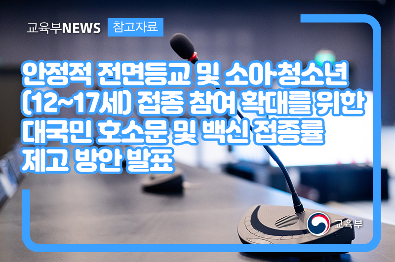 교육부(부총리 겸 교육부장관 유은혜)와 질병관리청(질병관리청장 정은경)은 안정적 전면등교 및 소아·청소년 접종 참여 확대를 위한 대국민 호소문 및 백신 접종률 제고방안을 12월 1일(수)에 공동 발표하였다.