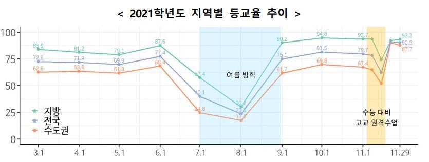 이러한 선제적 학교 일상회복 및 등교 확대 노력으로 작년 법정 수업일수 190일의 50% 수준이었던 등교율은, 올해 1학기에는 약 73%, 11월 22일(월) 전면등교 실시 이후 11월 29일(월) 기준으로 전국 평균 90.3%에 이르는 등 지속 증가해왔다.