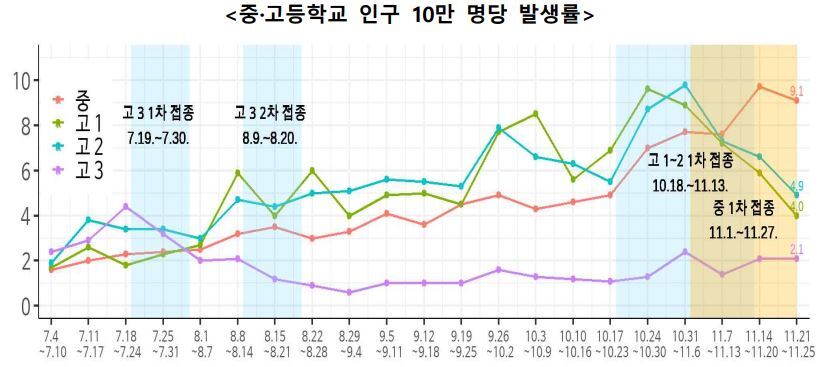 - 접종 완료한 고3은 낮은 발생률 유지, 고1‧2도 접종 시작 후 발생률 하락