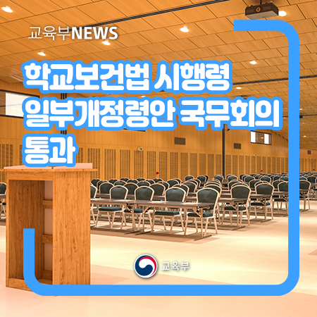 교육부(부총리 겸 교육부장관 유은혜)는 12월 7일(화), 국무회의에서 「학교보건법 시행령」 일부개정령안을 심의·의결하였다고 밝혔다.