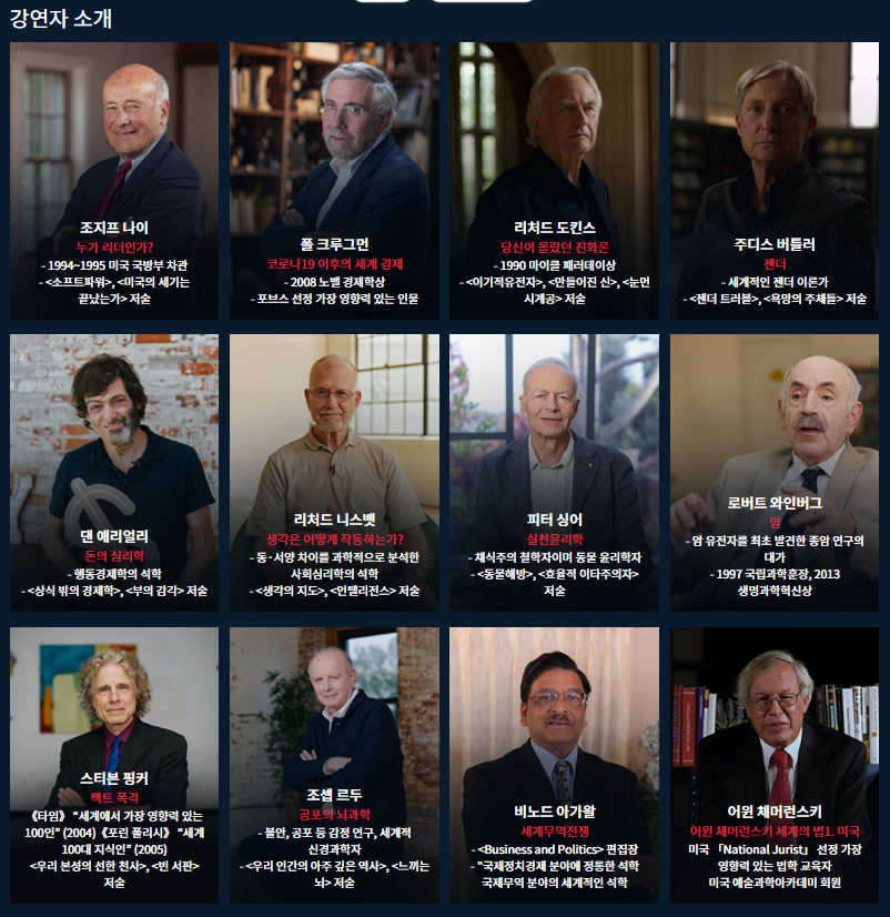 <소프트파워>, <미국의 세기는 끝났는가>를 저술한 정치학 박사 ‘조지프 나이’, 2008년 노벨 경제학상을 수상한 경제학 박사 ‘폴 크루그먼’, 행동경제학의 석학 ‘댄 애리얼리’ 등 약 40명의 다양한 분야의 지성인들을 만나볼 수 있습니다. 이들이 하나의 프로그램 안에 각각 다른 주제의 강연을 해서 새로운 지식과 정보를 제공하고 있다는 사실! 놀랍지 않나요?