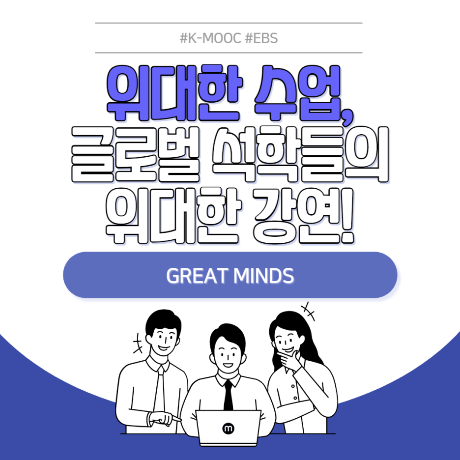 K-MOOC로 전 세계 지성인들의 의미 있는 강연을 누구나, 어디서나 무료로 들을 수 있다는 점, 굉장히 매력적이지 않나요? 글로벌 석학들의 강연 시리즈를 통해 온라인에서도 질 높은 강연을 청강할 수 있는 '위대한 수업 GREAT MINDS', 여러분들도 꼭 청강해보시기 바랍니다!