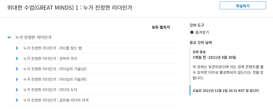 ‘조지프 나이’의 강연 ‘누가 진정한 리더인가?’에서는 리더를 찾는 방법, 권력의 주인, 리더십의 기술, 리더의 도덕, 마지막을 글로벌 리더의 자격까지 총 6개의 강의로 이루어져 있습니다. 각 강의는 20분 정도의 분량이었는데요. 1시간 가까이 되는 영상이 아닌 20분 정도의 강의로 챕터가 나뉘어 있으니 틈날 때마다 볼 수 있었던 점이 큰 장점인 것 같습니다!