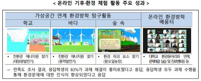 3개 부처는 올해 환경일기장, 환경방학탐구생활, 환경동아리, 교사환경교육연구모임 활동 등을 지원하였으며, 코로나19 상황에서도 비대면으로 기후·환경교육을 받을 수 있도록 온라인 환경방학 배움터(캠프)도 함께 운영하였다.