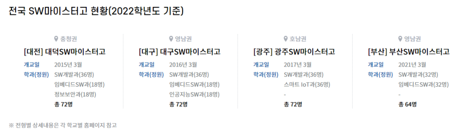 마이스터는 우리 말로 해석하면 한 분야의 전문가, 명장, 장인이라는 뜻인데요, SW마이스터고는 쉽게 말하자면 최고의 교육을 제공해 소프트웨어 분야에서 바로 실무를 볼 수 있는 마이스터를 조기에 양성하는 특수목적 고등학교라고 할 수 있습니다. 정부의 지원과 학교 및 산업체의 연계를 통해 추진하고 있는데요. 현재 충청권에는 대덕SW마이스터고, 영남권에는 대구SW마이스터고, 부산SW마이스터고, 호남권에는 광주SW마이스터고 총 4개교가 있습니다.