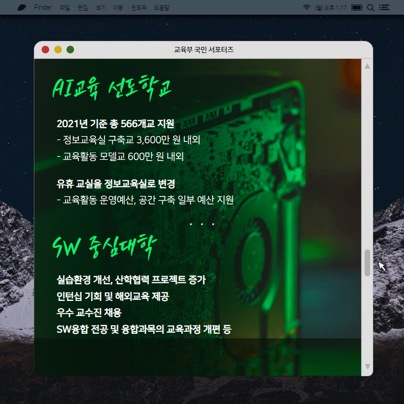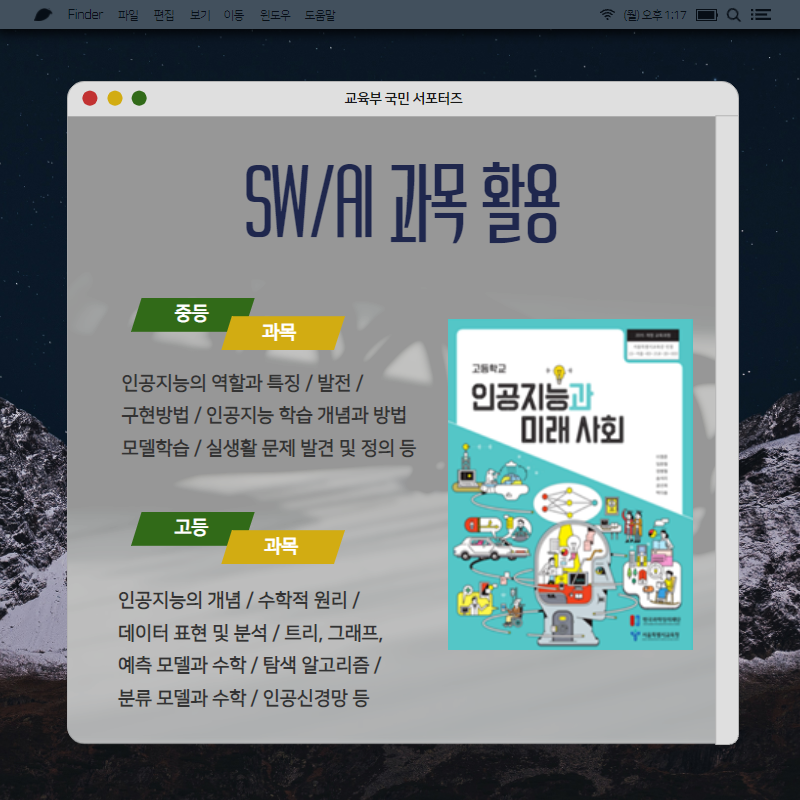 요즘에는 학교에서 정보/컴퓨터 시간에 소프트웨어 수업을 하고 있으며, SW/AI 과목을 학교 교육과정에 활용하는 추세라고 합니다.