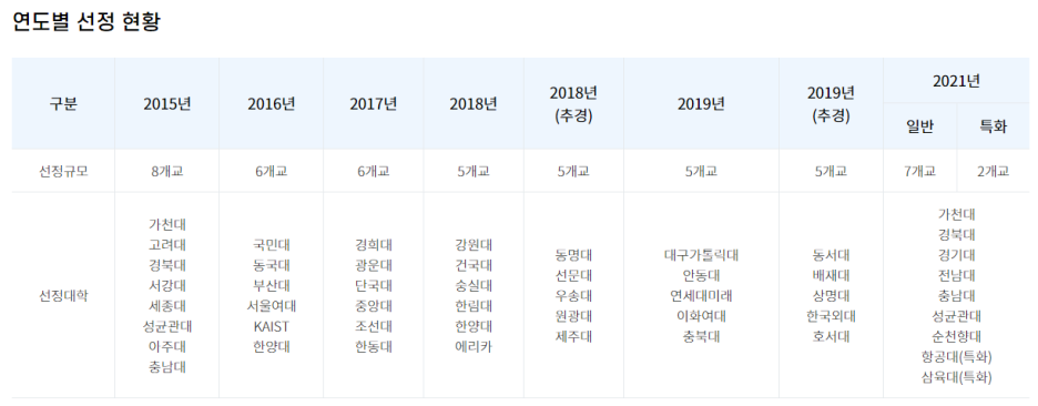 향후에는 SW중심 대학의 수를 점차 늘려 양성 인원 또한 증가하는 것을 계획하고 있습니다. 현재 SW중심 대학의 현황은 위의 표를 확인해보세요!
