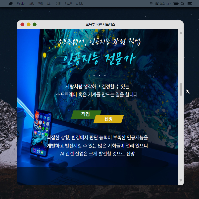 이 외에도 웨어러블 전문가, 클라우드 전문가, 드론 전문가, 로봇공학자, 블록체인 전문가, UX 전문가, 게임기획자 등 소프트웨어 및 인공지능 관련 직업이 많이 존재하고 있습니다.