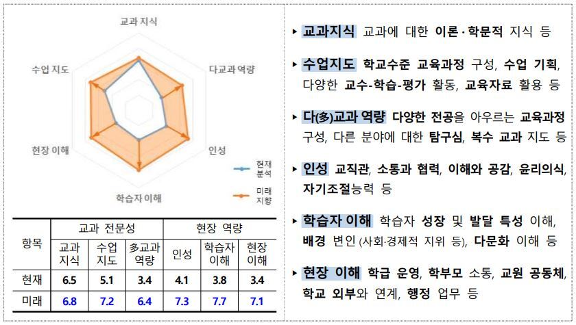 이를 위해 양성과정에서 함양해야 하는 핵심역량으로는 교과 지식, 수업지도, 다(多)교과 역량 등 교과 전문성과 인성, 학습자 이해, 현장 이해 등 현장 역량으로 조사되었다.