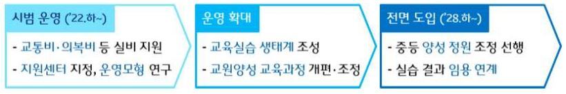 교육실습 학기제의 안정적 도입을 위해 2022년 하반기부터 시범운영을 시작하고, 교원 양성규모의 적정화가 이루어지는 시점을 고려하여 단계적으로 운영 규모를 확대하고자 한다.