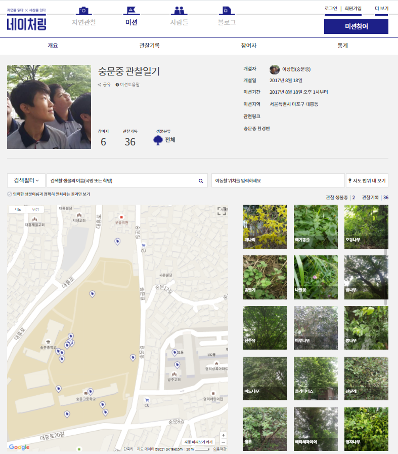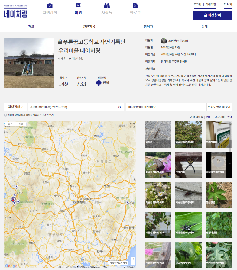 푸른꿈고등학교와 숭문중학교는 환경 수업 시간을 활용하여, 학교와 주변 마을에 함께 살아가는 다양한 생물을 관찰하고 기록하며 생태지도를 만들어나가고 있습니다. 이 친구들이 만들어나갈 생물다양성 지도는 생물다양성에 대해 이해하고, 자연과 인간이 공생하는 사회를 실현하는 작은 날갯짓이 되어줄 것입니다.