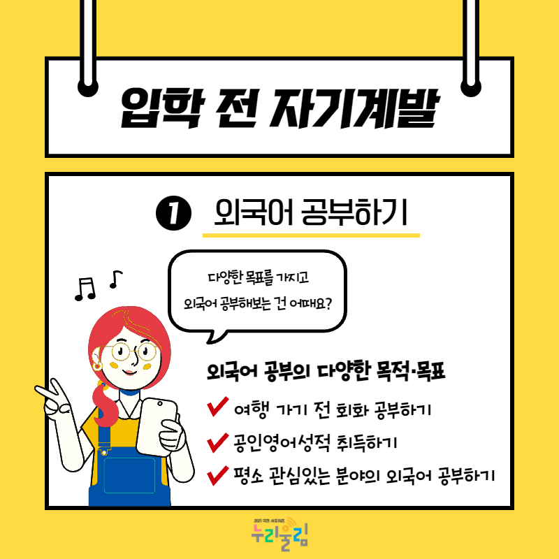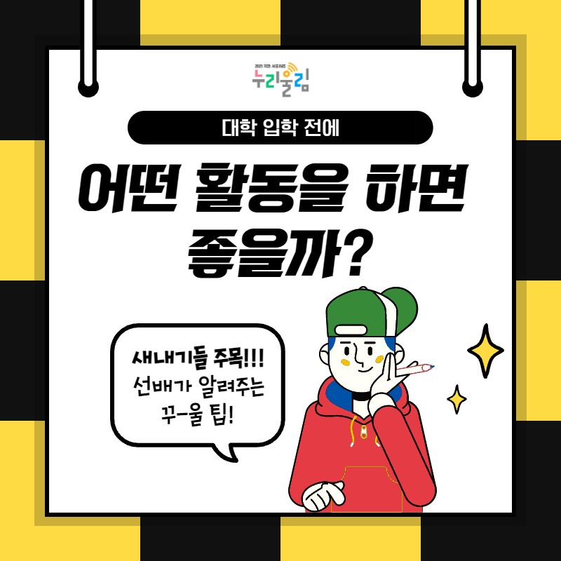 오늘은 대학에 입학하기 전에 어떤 활동을 하면 좋을지에 대해 알아보았습니다! 지금 대학에 입학하기 전 설레는 마음으로 겨울방학을 보내실 새내기들의 모습이 머릿속에 그려지는데요. 몸도 마음도 편하게 쉬면서 보내는 것도 좋지만 대학생이 되고 나면 자신에게 많은 도움이 될 활동들도 미리 시작해보면서 의미있게 보내보는 것은 어떨까요?