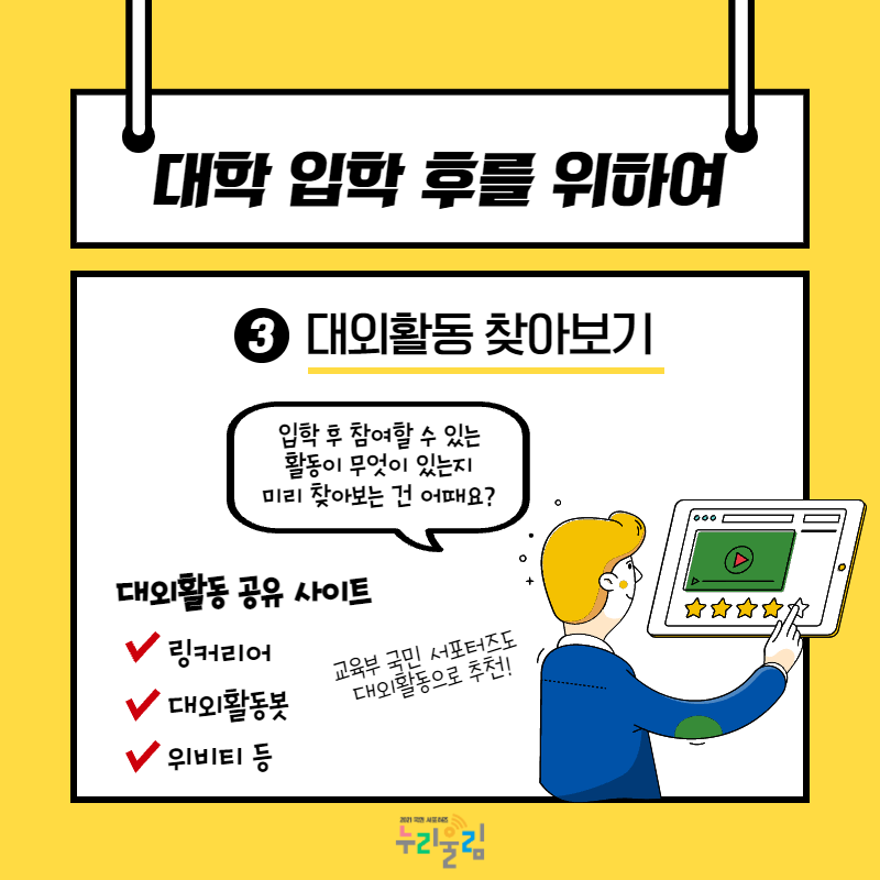 대외활동을 찾아볼 수 있는 사이트로는 링커리어, 대외활동봇, 위비티, 올콘, 캠퍼스픽 등이 있습니다. 사이트별로도 보여주는 대외활동이 천차만별이고, 대외활동에도 정말 다양한 유형이 존재하는데요, 대외활동 공고가 뜨는 사이트에 들어가서 여행/호텔/항공, 언론/미디어, 문화/역사, 교육, 경제/금융, IT/과학/공학/기술, 환경/에너지 등 본인의 관심 분야를 키워드로 검색하면 관련되어 많은 활동이 나온답니다. 이 중에서 각자의 관심 분야에 맞게 대학 입학 후 참여할 활동들에 대해 미리 알아보는 것도 좋을 것 같습니다. 대외활동을 통해 평소 궁금했거나 하고 싶었던 다양한 분야의 활동을 직·간접적으로 체험해볼 수 있으니, 관심이 있다면 한 번 도전해보시는 것은 어떨까요?