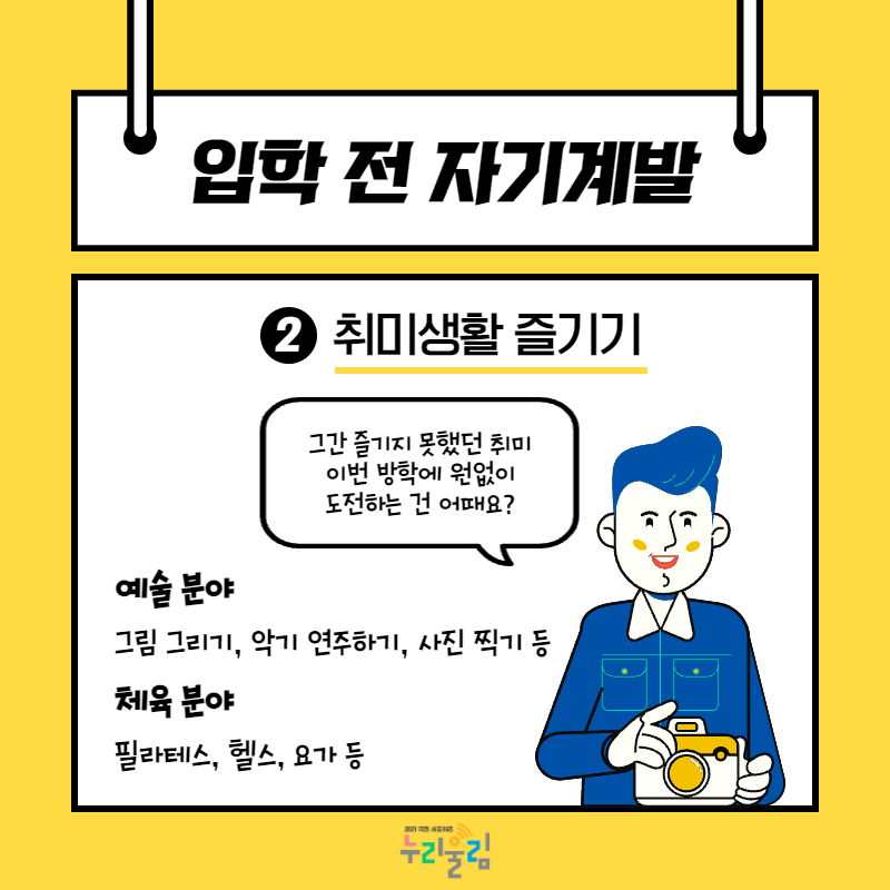 오늘은 대학에 입학하기 전에 어떤 활동을 하면 좋을지에 대해 알아보았습니다! 지금 대학에 입학하기 전 설레는 마음으로 겨울방학을 보내실 새내기들의 모습이 머릿속에 그려지는데요. 몸도 마음도 편하게 쉬면서 보내는 것도 좋지만 대학생이 되고 나면 자신에게 많은 도움이 될 활동들도 미리 시작해보면서 의미있게 보내보는 것은 어떨까요?