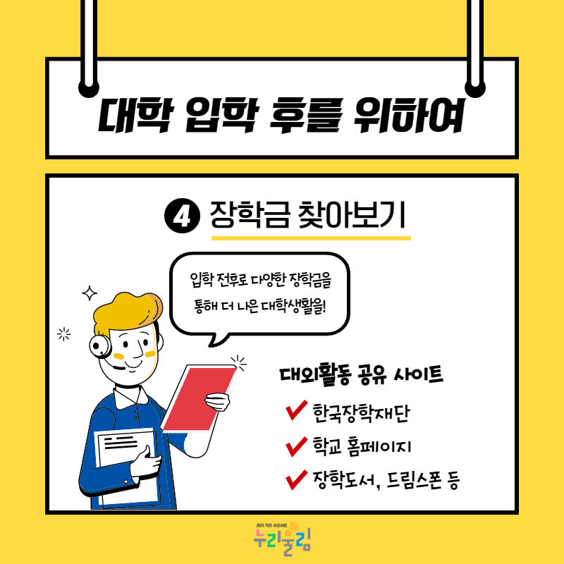 따라서, 대학교 입학 전 시간이 있을 때 미리 내가 받을 수 있는 장학금이 무엇이 있는지 찾아보고, 지원한다면 좀 더 수월하게 대학 생활을 할 수 있지 않을까요?
