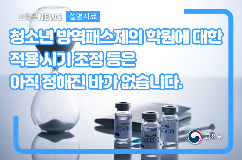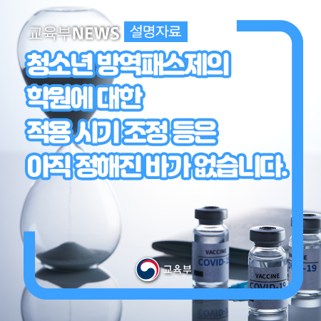 청소년 방역패스제의 학원에 대한 적용 시기 조정 등은 아직 정해진 바가 없습니다. 본문