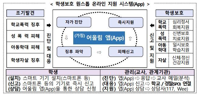 학생이 온·오프라인 학교폭력, 아동학대, 성폭력 등에 노출되면 즉시 감지하여 지원(신고·대응)하는 전방위적 학생보호 원스톱 온라인 시스템(가칭 ‘어울림 앱’)을 구축한다(~2022년).
