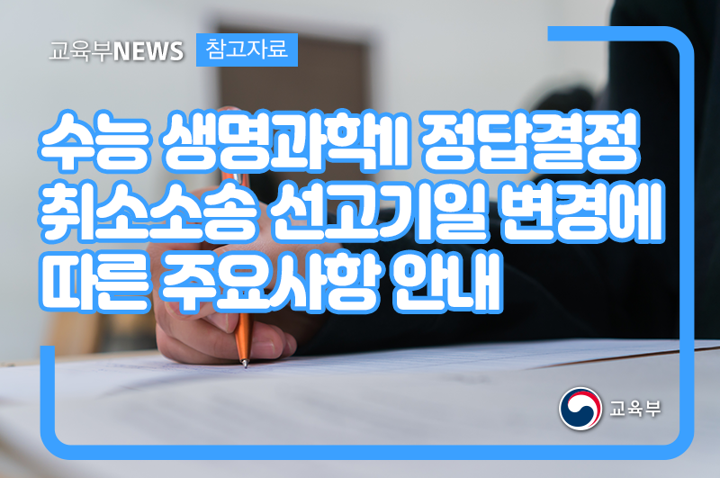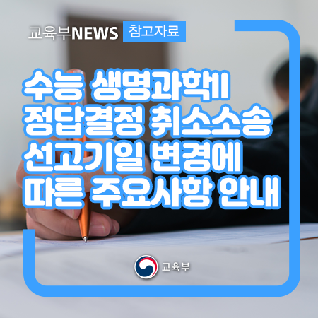 교육부(부총리 겸 교육부장관 유은혜)는 2022학년도 수능 생명과학II 정답결정 취소소송의 선고기일 변경*에 따른 주요사항을 안내하였다.