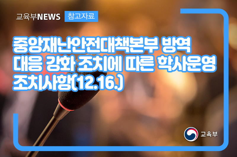 교육부(부총리 겸 교육부장관 유은혜)는 12월 16일(목), 중앙재난안전대책본부(이하 중대본)에서 일상회복 잠시 멈춤과 거리두기 강화 조치를 시행함에 따라, 교육분야의 조치사항을 마련하여 시도교육청과 공유하고, 각급 학교에 신속하게 안내할 계획이다.