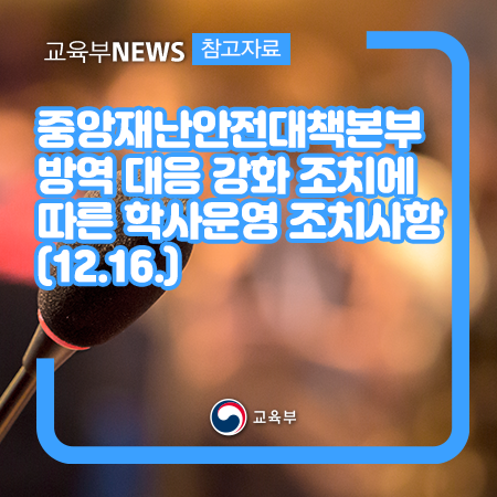 교육부는 12월 16일(목) 14시에 차관 주재 「학교일상회복지원단(차관-시도교육청 부교육감)」 회의를 개최하여 거리두기 강화조치 발동에 따른 교육분야 조치사항을 시도교육청에 안내하고,