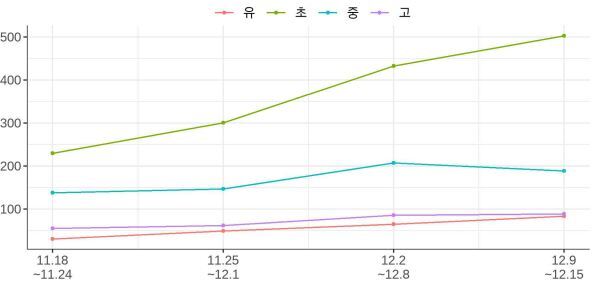 - 12.9.∼12.15.간 일평균 학생 67.0명, 교직원 12.6명 확진