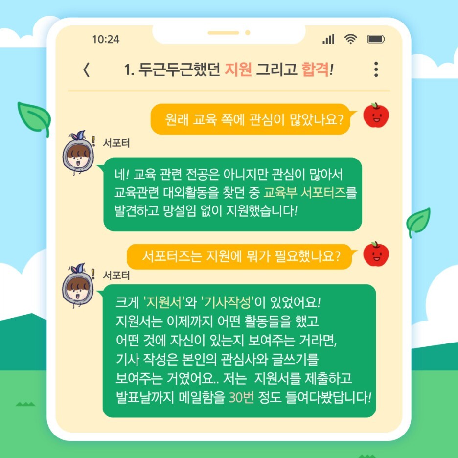 저는 교육과 관련된 전공을 하고 있지는 않지만, 고등학교 때부터 꾸준히 교육에 대한 관심이 있었는데요. 따라서 교육과 관련된 대외활동을 알아보던 중에 교육부에서 서포터즈를 모집한다는 공고문을 보고, 한 치의 망설임 없이 지원했어요!