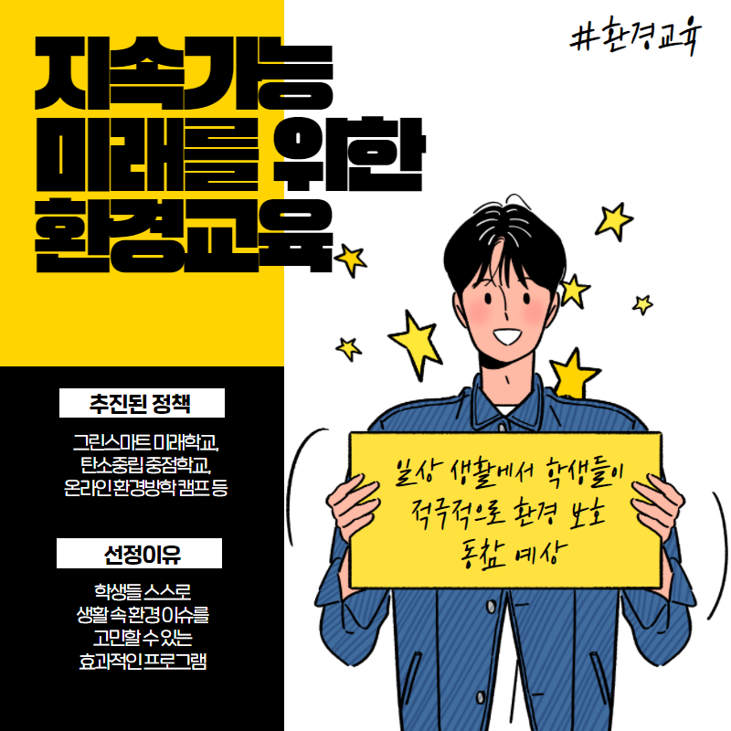 해당 정책은 이전 환경 교육과정과는 달리, 생활 속 환경 이슈를 학생들이 스스로 고민할 수 있는 프로그램들로 구성되어 있습니다. 온라인 환경방학 캠프와 같이 메타버스를 활용하여 숲을 파괴하는 원인을 찾거나 바다 쓰레기를 분리수거하는 활동을 실제로 체험하는 등 생활 속에서 환경을 살리기 위해 스스로 생각하고, 실천할 수 있는 과정으로 구성되어서 학생들이 쉽게 체감할 수 있다는 점이 좋았습니다.