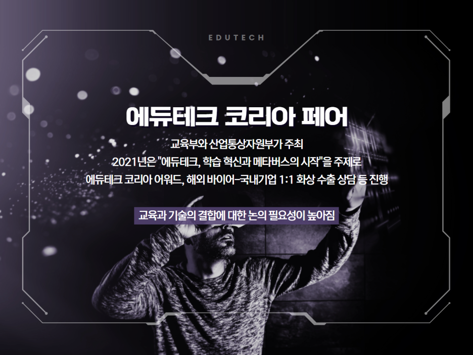 혹시 ‘에듀테크 코리아 페어(Edutech Korea Fair)’라는 행사를 들어보셨나요? 이 행사는 교육부와 산업통상자원부가 매년 주최하는 행사입니다. 2021 에듀테크 코리아 페어는 9월 14일에 개최되었는데요. 올해 박람회 주제는 ‘에듀테크, 학습 혁신과 메타버스의 시작’이라는 주제로, 미래 교육 기술과 관련하여 우수 제품을 소개하고, 민·관·학 전문가가 함께 세계적인 동향을 분석하며 선도 사례를 공유하는 자리를 마련했다고 해요. 프로그램으로는 교육 분야의 에듀테크의 발전에 기여한 기업들을 수상하는 ‘에듀테크 코리아 어워드’ 행사와 해외 바이어와 국내 기업 간 1:1 화상 수출 상담 프로그램 등이 진행되었답니다. 교육부에서는 교육과 기술의 결합인 에듀테크의 중요성을 인지하고 이러한 박람회뿐 아니라 다양한 방면에서 빠르게 K-에듀테크의 발전을 도모하고 있다고 하는데요. 그래서 오늘은 에듀테크가 교육 현장에서 구체적으로 어떻게 적용되는가를 살펴보도록 하겠습니다! 그전에 우선 에듀테크에 대해 간략히 살펴볼까요?