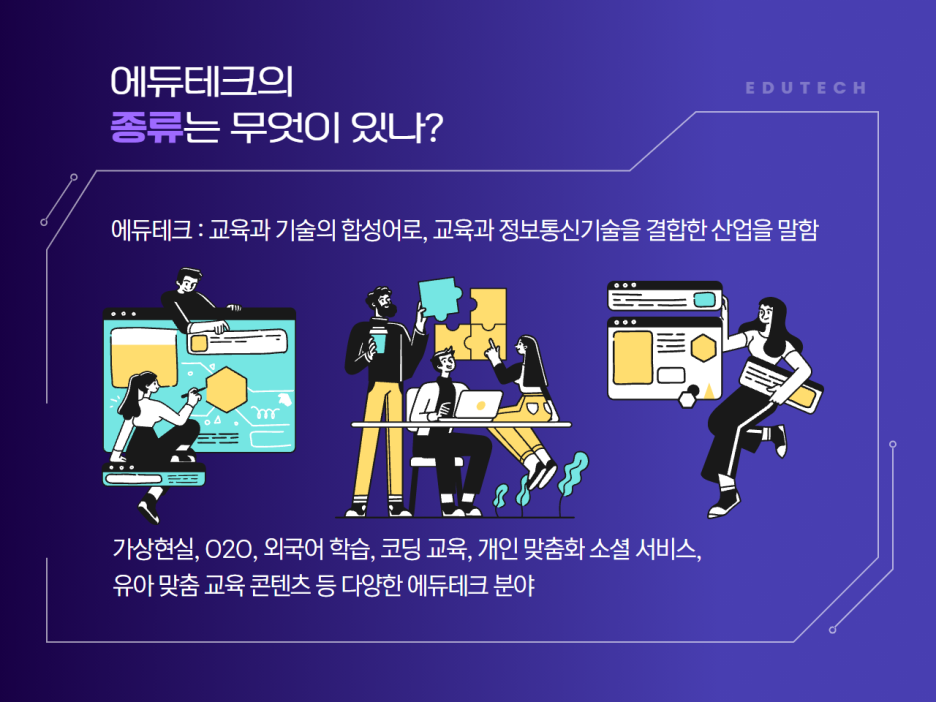 에듀테크는 교육과 기술의 합성어로 교육과 정보통신기술을 결합한 산업을 말합니다. 즉, 교육에 정보통신기술(ICT)을 접목해서 학습자의 교육 효과를 높이는 산업이랍니다. 그렇다면, 에듀테크 하면 무엇이 떠오르시나요? 대부분 온라인 학습 영상을 제공하는 것이나 온라인 토론, 실시한 화상 수업 등을 떠올리실 텐데요. 사실 에듀테크의 종류는 정말 다양합니다. 가상현실(VR), O2O, 외국어 학습, 코딩 교육. 개인 맞춤화 소셜 서비스, 유아 맞춤 교육 콘텐츠 제공 등 다양한 분야에서 에듀테크가 활용되고 있습니다.