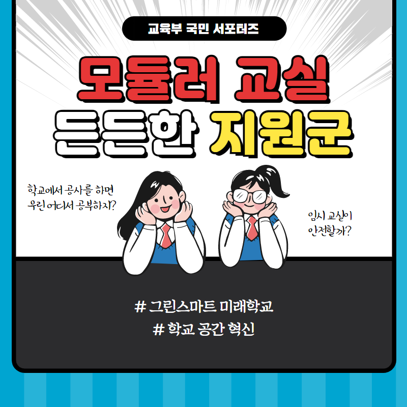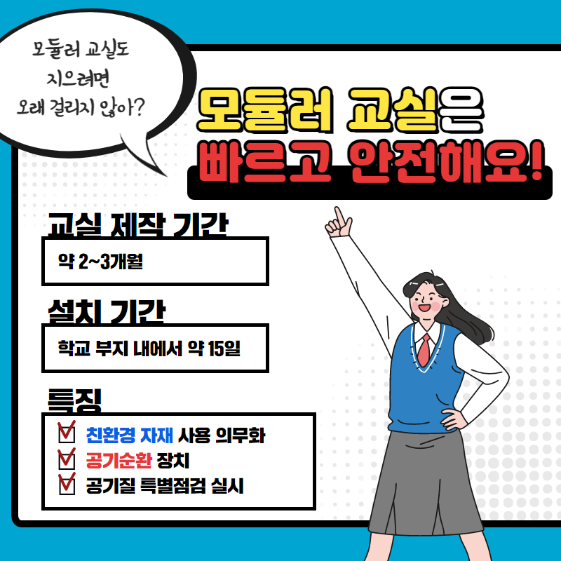 미래지향적인 학교 환경을 만들기 위해 필요한 보수 기간 동안 학생들의 학습권을 보장하려고 노력하는 교육부의 모습을 엿볼 수 있었는데요. 모듈러 교실이라는 든든한 지원군이 있기에 학생들이 좀 더 쾌적한 학교생활을 할 수 있는 그린스마트 미래학교 사업이 추진될 수 있습니다. 우리 학생들을 위한 안전하고 쾌적한 모듈러 교실, 함께 지켜봐 주세요!